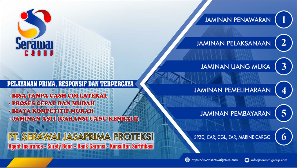 PT. SERAWAI JASAPRIMA PROTEKSI - Merupakan Perusahaan Agen Asuransi berdomesili dijakarta yang TERPERCAYA dan PROFESIONAL bergerak dibidang pelayanan jasa penerbitan jaminan Asuransi (Surety Bond) dan Bank Garansi (Bank Guarantee) yang berkerjasama langsung dengan perusahaan penjaminan (Surety Company) dari Instansi Pemerintah maupun Swasta Nasional yang diawasi langsung oleh Otoritas Jasa Keuangan (OJK) dan Terdaftar Di Kementrian Keuangan Republik Indonesia.